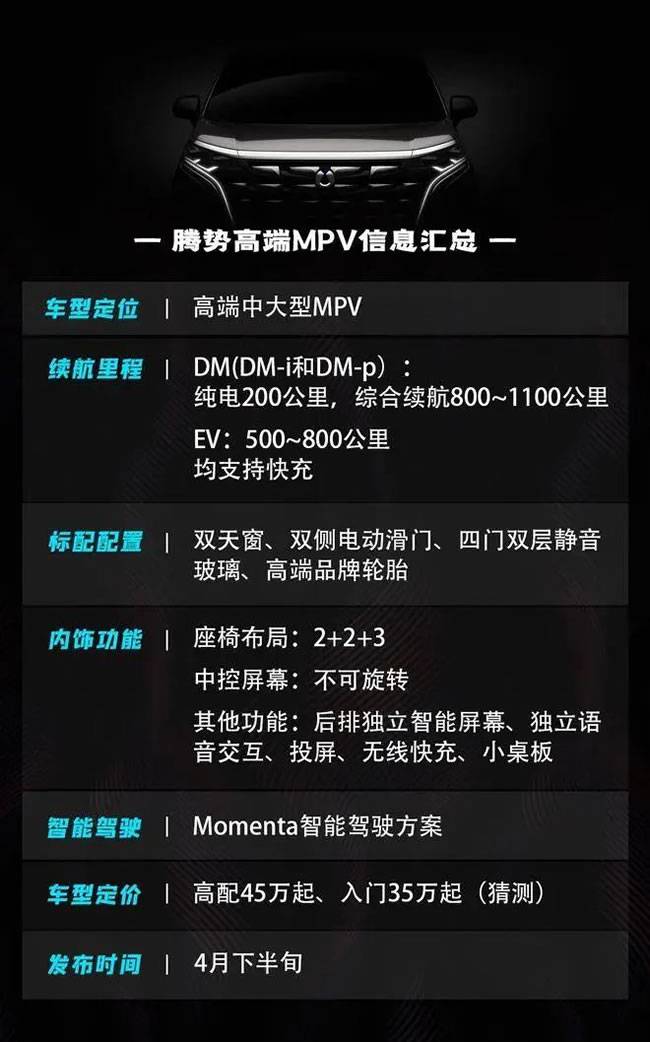 同时,赵长江表示,新款MPV车型提供EV和DM(插电混动两种版本)共三种选择,并将配备四驱和两驱系统,在价格之间会较宽。值得一提的是,早在4月1日,赵长江还发布了关于腾势高端MPV的宣传视频,而关于新车的外观、配置等细节信息也曝光了。