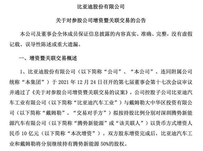 如今,12年已经过去,比亚迪再也不是当初的比亚迪。2021年年底,比亚迪发布公告称,其与另一个大股东戴姆勒拟分别对腾势增资人民币10亿元,拟完成双方在腾势的股权转让(此前双方各持股50%,该转让完成后,比亚迪和戴姆勒将分别持有腾势90%和10%的股份)。