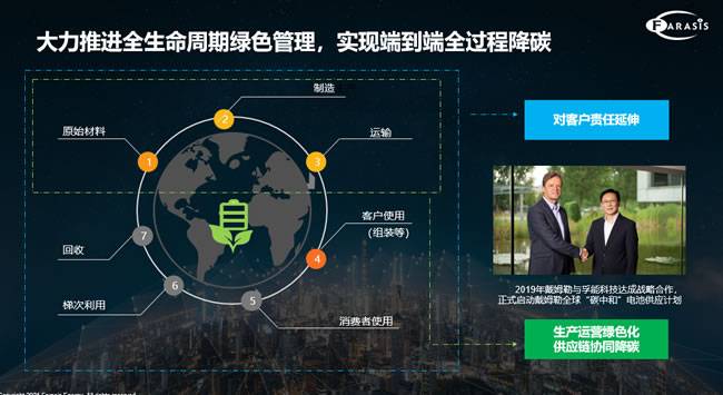 碳减排阶段——节能降碳与价值链责任延伸。2018年,为保证戴姆勒项目电池供应,孚能科技在江苏镇江设计并建设了年产能24GWh的生产基地。这家融合了戴姆勒先进设计理念和成熟管理经验的现代化工厂自设计伊始就被烙上了深刻的碳中和印记,如通过工厂屋面分布式光伏等形式来节省电网用电,使用周边纸厂内热电联供装置生产过程中多余的蒸汽来降低电耗,在厂区内拟建储能电站缓解工厂在电力峰值时段对电网的依赖,对工厂内产生的废弃物进行妥善处置等。随着该公司增产节能措施逐步落地,2021年度单位能耗较去年降低50%以上。2021年6月,孚能科技镇江工厂通过了第三方DEKRA颁发的碳中和生产认证,证明了其在碳中和能力方面已进入领先行列。