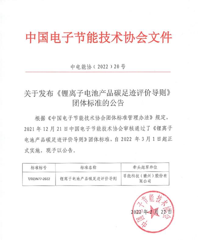 2022年3月8日,由中国电子节能技术协会主导、孚能科技牵头主笔的《锂离子电池产品碳足迹评价导则》正式生效。这也是国内首个锂离子电池产品碳足迹领域的评价标准,对于国际标准对标、本土化供应链建设以及推动绿色能源“双碳”目标将具有重要意义。