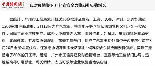 上述报道中提到,广州市工信局在3月18日为广汽本田、捷普电子等企业从深圳管控区抢运出一批配件,保障了企业连续生产。此外,还调集无人车,随时待命,赴深圳、东莞闭环运输原材料、零配件等。并多次协调深圳、东莞工信部门,促成广汽本田共46家位于两市的供应商3月20日全部恢复供应。还紧急协调深圳宝安区某企业等9家核心供应商恢复供应,保障了捷普电子80%的开工率。