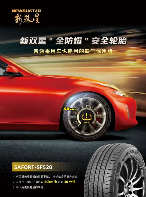 紧随其后上市的双星“全防爆”安全轮胎,汇聚了全球智慧。其独特的“Safort魔性”支撑体所采用的专利结构和配方技术,既兼具了普通防爆胎的零胎压行驶功能,又充分体现了普通轮胎的舒适性、静音性较好的优点,适用于非配备特殊减震系统和配备特殊减震系统的所有车辆,轮胎在零胎压情况下,以60km/h的速度行驶30分钟以上。双星的“全防爆”安全轮胎比普通防爆胎更省油、更舒适,比普通轮胎更安全、更放心,而且让所有的乘用车辆都能用上防爆胎。