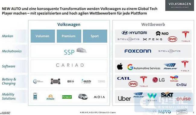 近日,在柏林的一次大众汽车集团董事会上,该公司对2030 NEW AUTO战略进行了阶段性盘点,并讨论了今年工作的优先事项,同时还首次对外曝光了大众汽车集团在品牌、整车、技术平台、软件、电池等领域的主要竞争对手,其中小鹏汽车、蔚来、比亚迪、宁德时代等中国企业在列。