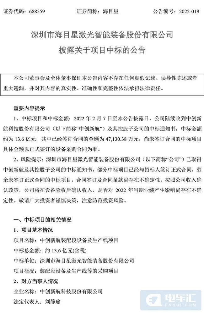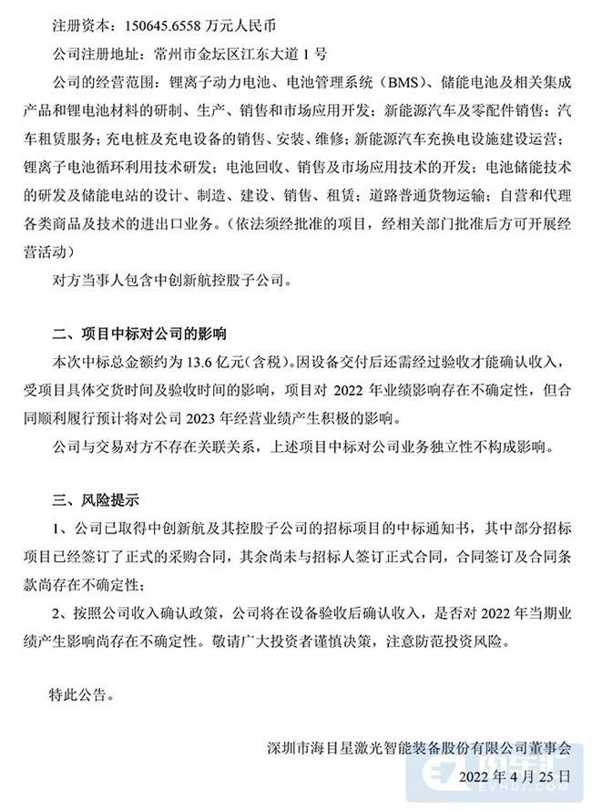 4月24日晚间,海目星公告,2月7日至今,陆续收到中创新航及其控股子公司的中标通知书,中标金额约为13.6亿元,其中已经签订合同的金额为4.71亿元,项目名称为中创新航装配段设备及生产线项目。因设备交付后还需经过验收才能确认收入,受项目具体交货时间及验收时间的影响,项目对2022年业绩影响存在不确定性。