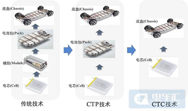 CTC技术即“cell to chassis”的缩写,从英文字面可以很直观地看到,cell指的是电池单体、chassis就是底盘,这项技术是将电池电芯直接集成到整车底盘上。