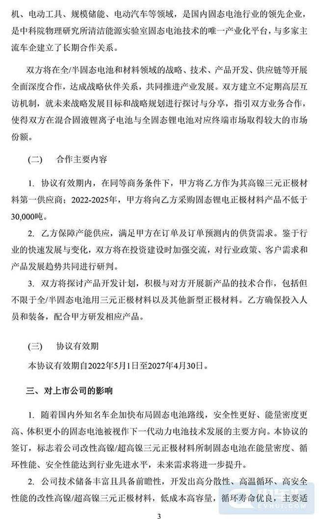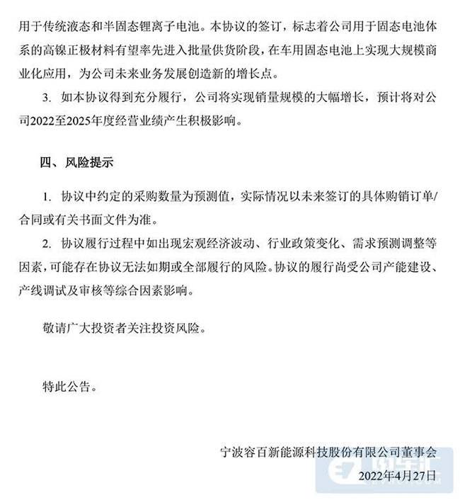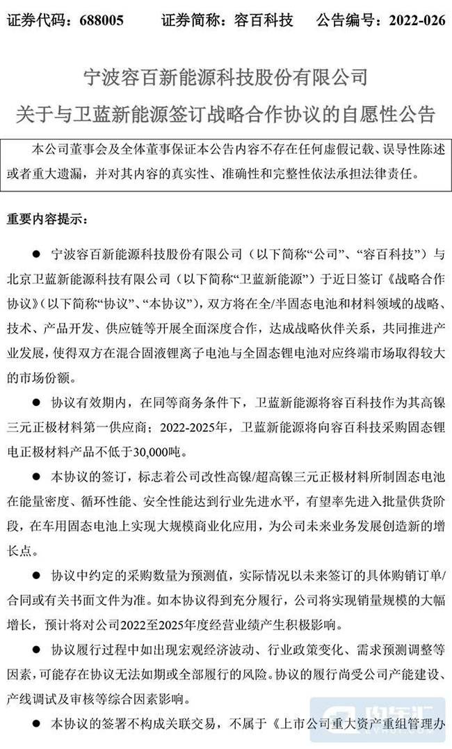 公告显示,协议有效期内,在同等商务条件下,卫蓝新能源将容百科技作为其高镍三元正极材料第一供应商;2022-2025年,卫蓝新能源将向容百科技采购固态锂电正极材料产品不低于30000吨。