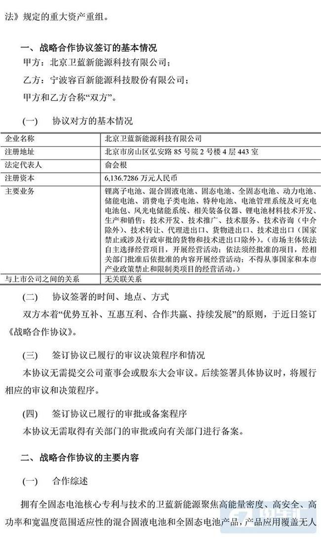 电车汇消息:4月26日晚间,容百科技发布公告称,与卫蓝新能源于近日签订《战略合作协议》,双方将在全/半固态电池和材料领域的战略、技术等开展全面深度合作,使得双方在混合固液锂离子电池与全固态锂电池对应终端市场取得较大的市场份额。
