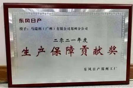 马瑞利郑州分公司在2021年全球疫情、芯片短缺、暴雨洪灾等巨大压力下,全员团结协作、周密部署,积极统筹,克服了诸多困难,圆满完成了年度各项生产目标,再次因为在品质保障、纳期保障、安全保障等各方面的突出贡献,荣获东风日产授予的“生产保障贡献奖”。