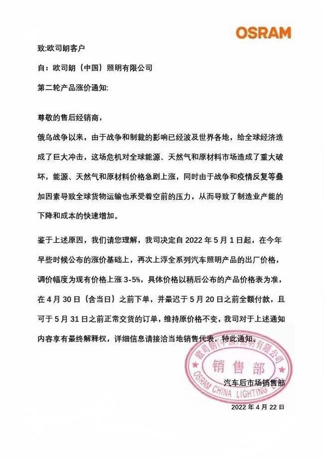基于现实原因,欧司朗决定自2022年5月1日起,在今年早些时候公布的涨价基础上,再次上浮全系列汽车照明产品的出厂价格,调价幅度为现有价格上涨3-5%。同时,对于在4月30日(含当日)之前下单,并最迟于5月20日之前全额付款的经销商,且可于5月31日之前正常交货的订单,维持原价格不变。
