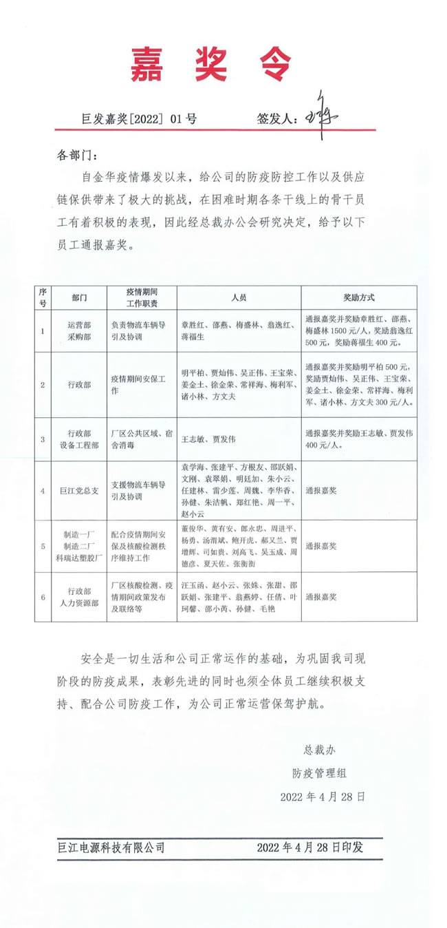 未来,巨江电源将继续坚持党建引领,落实各项工作要求,风雨同舟,共筑疫情防控安全屏障,推动企业供应链健康稳定发展。