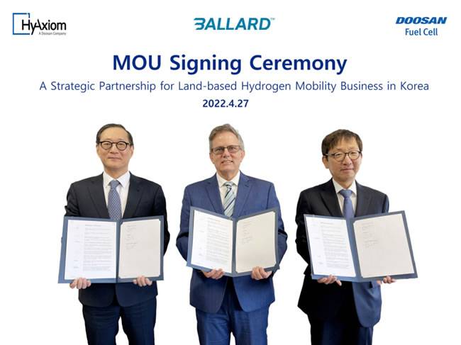 斗山燃料电池公司及斗山公司的全资北美子公司HyAxiom,已在康涅狄格州(HyAxiom的总部所在地)与巴拉德公司签署了一份理解备忘录,将把巴拉德的核心PEM技术整合到动力总成中,用以开发氢燃料电池动力汽车。