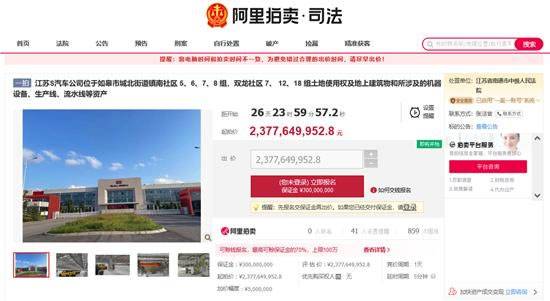 此次拍卖的是赛麟汽车位于如皋市城北街道镇南社区5、6、7、8组,双龙社区7、12、18组土地使用权及地上建筑物和所涉及的机器设备、生产线、流水线等资产,起拍价近23.8亿元,将于2022年5月30日公开拍卖。