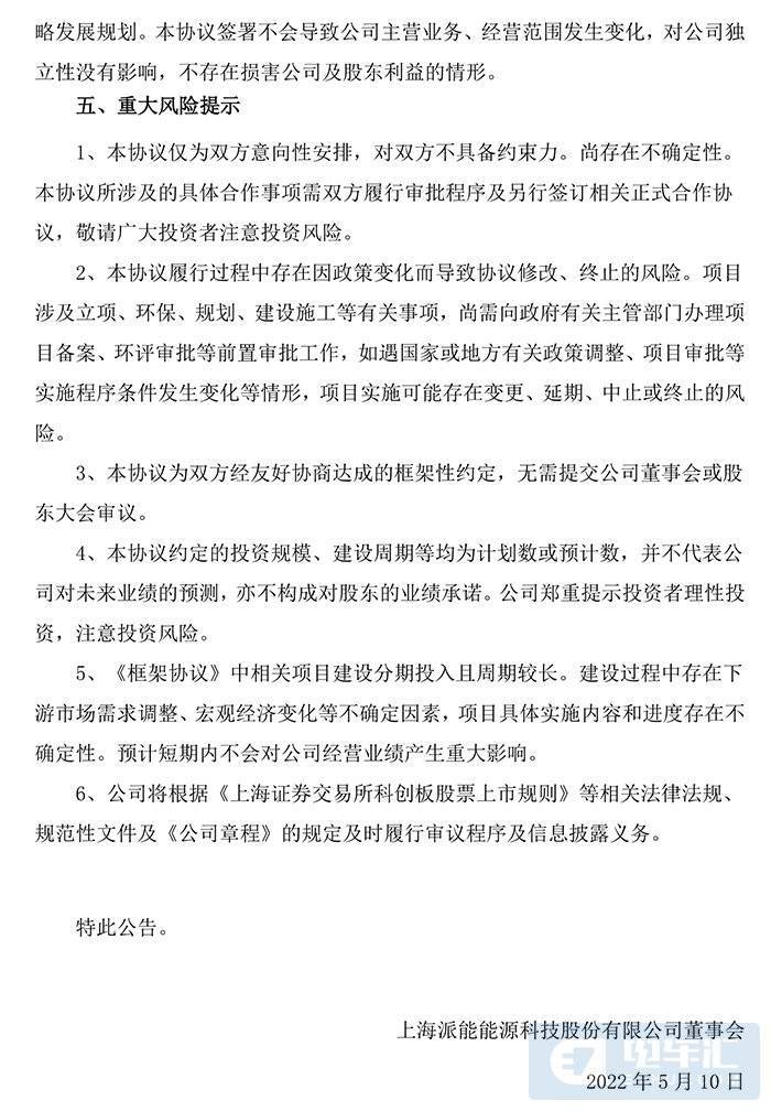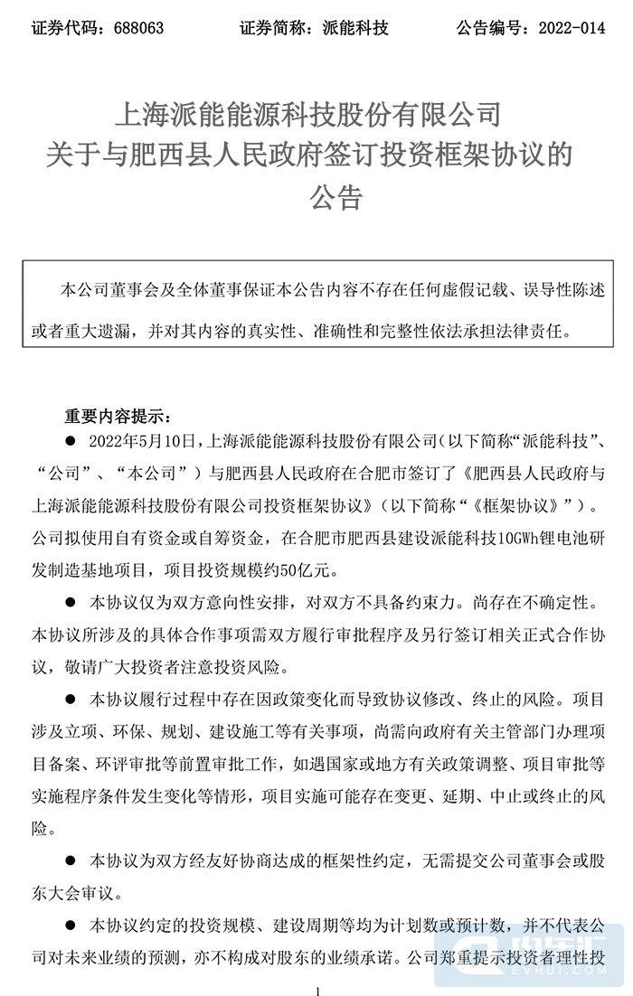 5月10日,派能科技发布公告披露,公司与合肥市肥西县人民政府签订了投资框架协议,公司拟使用自有资金或自筹资金,在肥西县建设派能科技10GWh锂电池研发制造基地项目,项目投资规模约50亿元。