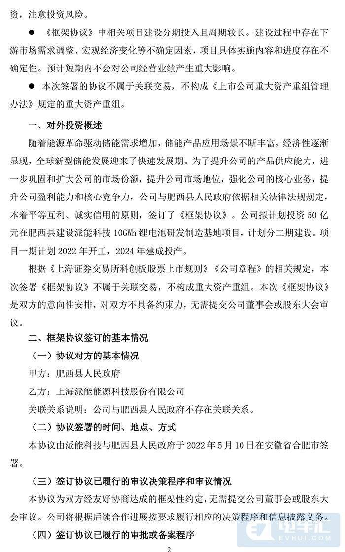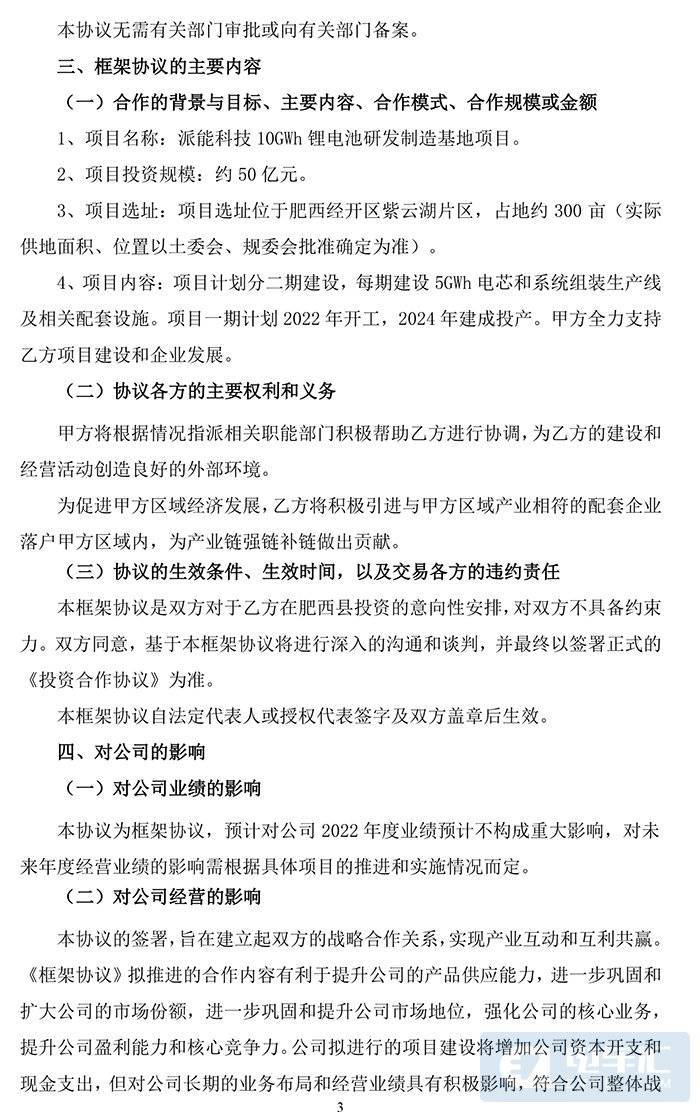 肥西县人民政府将根据情况指派相关职能部门,积极帮助派能科技进行协调,为公司建设和经营活动创造良好的外部环境。派能科技将积极引进与肥西县区域产业相符的配套企业落户肥西县区域内,为产业链强链补链作贡献。