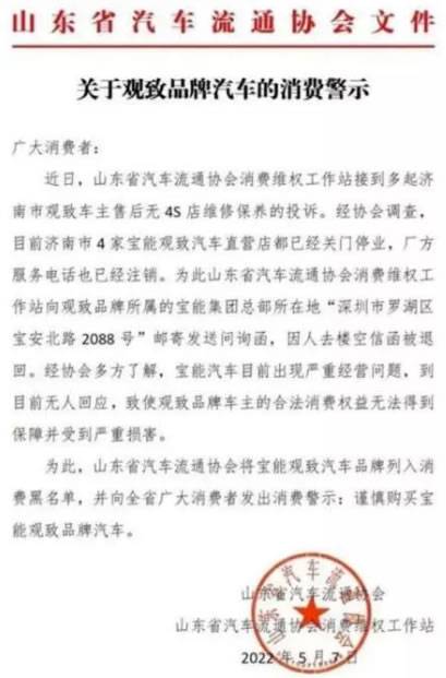 5月10日,山东省汽车流通协会表示,经协会多方了解,宝能集团旗下宝能汽车目前出现严重经营问题,到目前无人回应,为此,协会将宝能观致汽车品牌列入消费黑名单,并警示消费者谨慎购买观致品牌汽车。