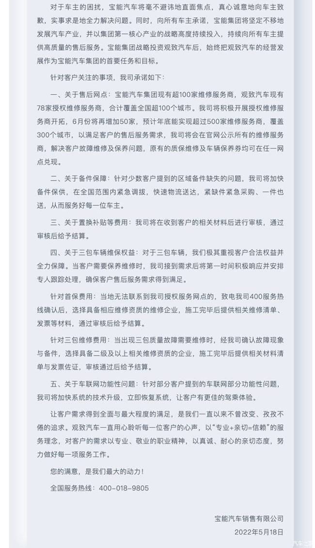 对于车主的困扰,宝能汽车将毫不避讳地直面焦点,真心诚意地向车主致歉,实事求是地全力解决问题。同时,向所有车主承诺,宝能集团将坚定不移地发展汽车产业,并以集团第一核心产业的战略高度持续投入,持续向所有车主提供高质量的售后服务。宝能集团战略投资观致汽车后,始终把观致汽车的经营发展作为宝能汽车集团的首要任务和目标。