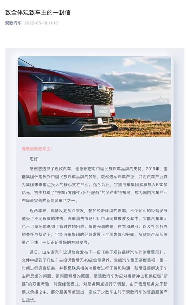 近日,山东省汽车流通协会发布了一份《关于观致品牌汽车的消费警示》,文件中提到了几位车主投诉售后无4S店维修保养。宝能汽车集团高度重视,第一时间进行调查核实,并积极联系相关消费者进行了解和沟通,随后妥善解决了车主所反馈的问题。该问题背后的原因,是观致汽车为应对疫情冲击和供应链“断链”的双重考验,转变经营模式,对服务网点进行了调整。由于售后服务处于新模式承接之中,部分服务网点退出,造成了少数车主对于观致汽车的售后服务产生担忧。