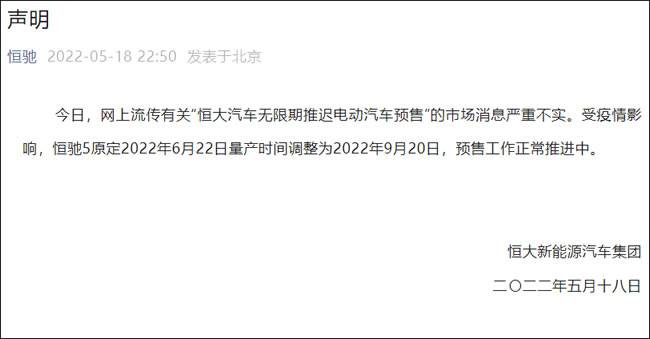 微信公众号“恒驰”5月18日发布声明称,18日,网上流传有关“恒大汽车无限期推迟电动汽车预售”的市场消息严重不实。受疫情影响,恒驰5原定2022年6月22日量产时间调整为2022年9月20日,预售工作正常推进中。