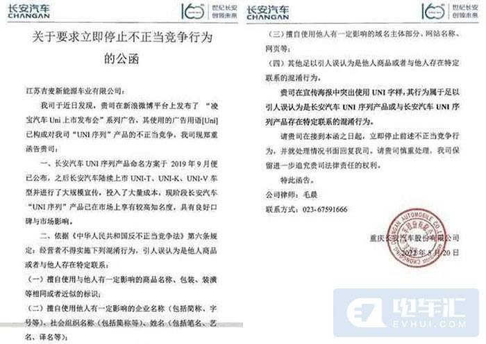 《公函》具体内容为,吉麦新能源旗下品牌凌宝汽车发布了“凌宝汽车Uni上市发布会”系列广告,广告语中使用了Uni产品名称,与长安UNI系列容易产生混淆和误导,要求吉麦新能源立刻停止该混淆行为,并以书面形式回复处理情况。