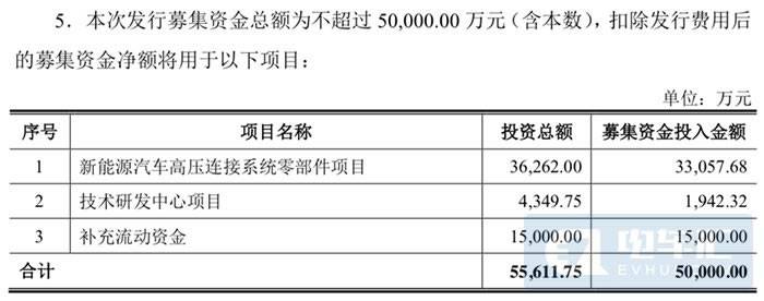 预案显示,华菱精工拟5亿元建设的主要项目名为“新能源汽车高压连接系统零部件项目”,投资总额36262万元,募集资金投入33057.68万元;此外,技术研发中心项目投资总额4349.75万元,募集资金将投入1942.32万元;另外1.5亿元将用于补充公司流动资金。
