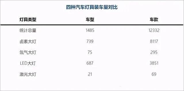 根据对外公布的数据统计,“记录在册”的750个国Ⅵ车型、6800个国Ⅵ车款来看,配置卤素大灯的车款达到3710款,超过配置氙气大灯、LED大灯、激光大灯三种大灯车款的总和,足见卤素灯大军的浩浩荡荡。