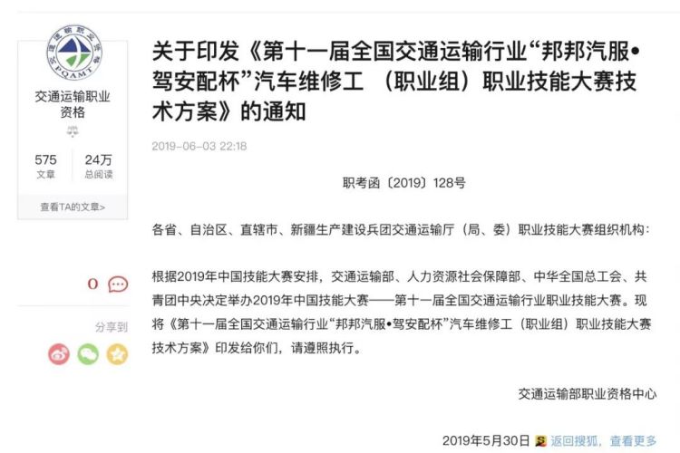 中华人民共和国交通运输部职业资格中心正式下发大赛通知