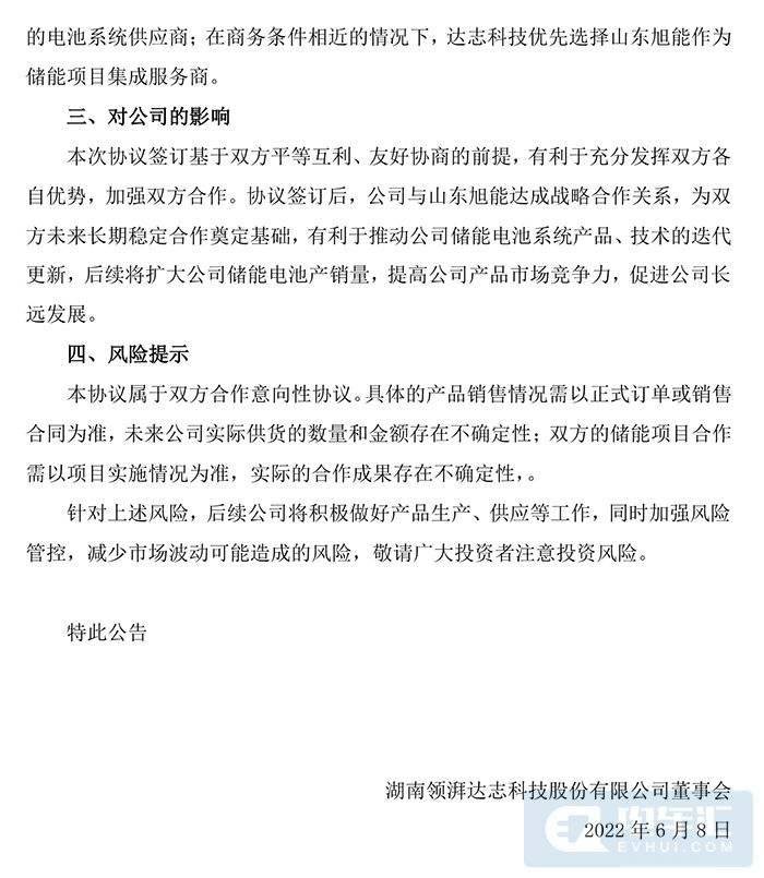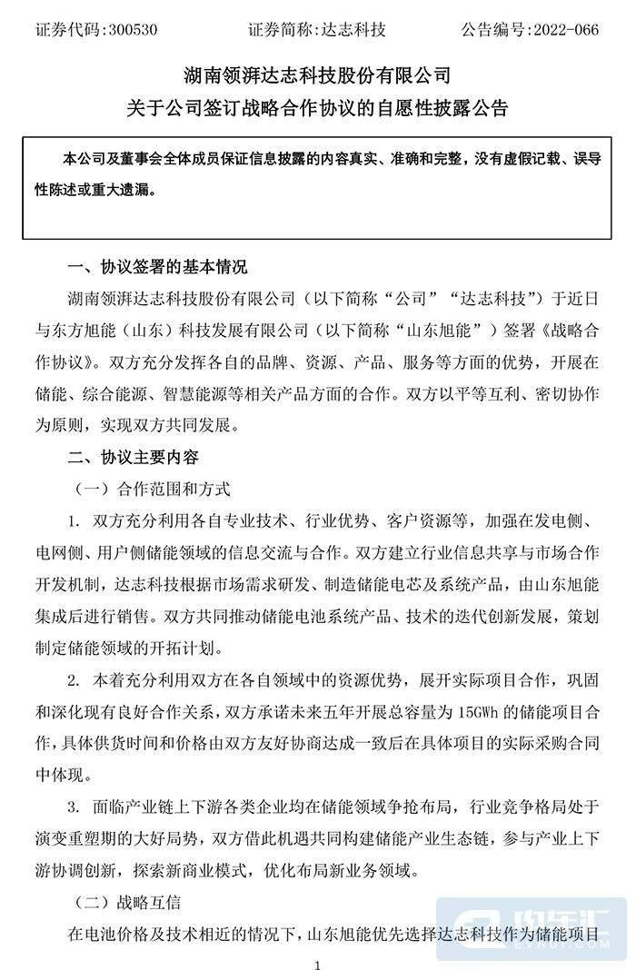 6月7日晚间,达志科技公告称,与东方旭能(山东)科技发展有限公司签订战略合作协议。公司根据市场需求研发、制造储能电芯及系统产品,由山东旭能集成后进行销售;双方共同推动储能电池系统产品、技术的迭代创新发展,策划制定储能领域的开拓计划。