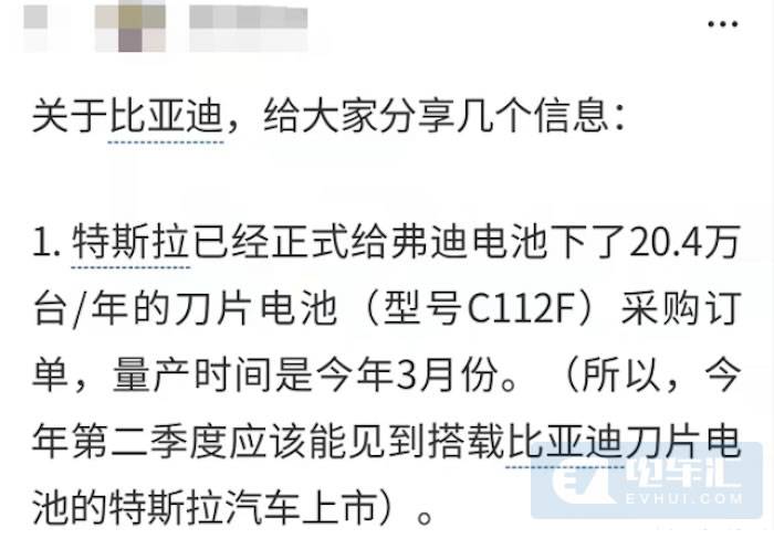 今年2月份,网络上多组消息显示,比亚迪将正式供货特斯拉刀片电池。“特斯拉已经正式给弗迪电池下了20.4万台/年的刀片电池(型号C112F)采购订单,量产时间是今年3月份。”