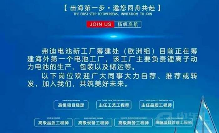 此前就有消息称比亚迪将在美国建电池厂,以供应特斯拉弗里蒙特工厂。而今年3月份,比亚迪旗下弗迪电池的一份内部招聘信息显示,弗迪电池新工厂筹建处(欧洲组)目前正在筹建海外第一个电池工厂,该工厂主要负责锂离子动力电池的生产、包装以及储运等。