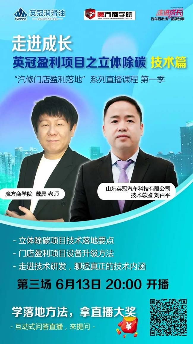 第三场直播,英冠技术总监刘百平老师,深度解剖立体除碳项目技术的落地要点,也让大家更专业的了解门店盈利项目的技术要点、设备升级办法,多元提升汽修门店立体除碳项目的盈利路径。