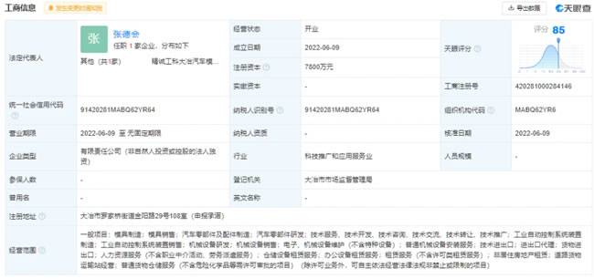 据了解,该公司经营范围包含模具制造;模具销售;汽车零部件及配件制造;汽车零部件研发;技术服务、技术开发、技术咨询、技术交流、技术转让、技术推广;工业自动控制系统装置制造;工业自动控制系统装置销售;机械设备研发;机械设备销售;电子、机械设备维护(不含特种设备);普通机械设备安装服务;技术进出口;进出口代理;货物进出口等。