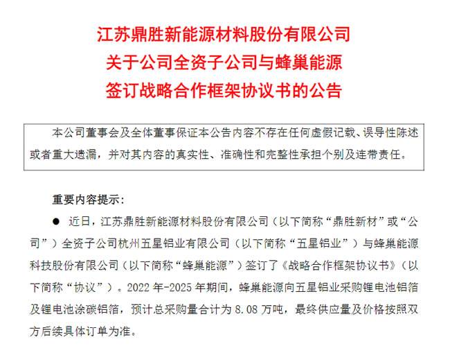 根据协议,蜂巢能源将与国投罗钾在加强在锂资源领域开展战略合作,与五星铝业则建立长期战略合作关系,其中在2022年-2025年期间,蜂巢能源向五星铝业采购锂电池铝箔及锂电池涂碳铝箔,预计总采购量合计为8.08万吨,最终供应量及价格按照双方后续具体订单为准。