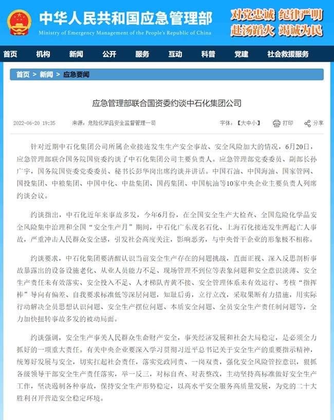 记者从应急管理部获悉,针对近期中石化集团公司所属企业接连发生生产安全事故、安全风险加大的情况,6月20日,应急管理部联合国务院国资委约谈了中石化集团公司主要负责人。