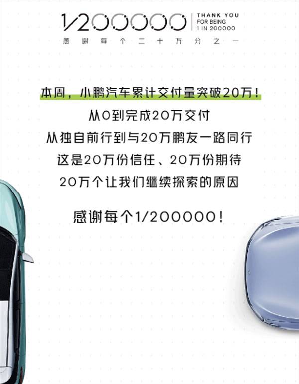 6月21日消息,小鹏汽车官方今日宣布,品牌累计交付量已突破20万台。至此,小鹏汽车成为了继蔚来后,第二家销量破20万台的国产造车新势力车企。