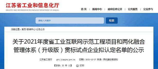 2021年度省工业互联网示范工程项目和两化融合管理体系(升级版)贯标试点企业拟认定名单公示。