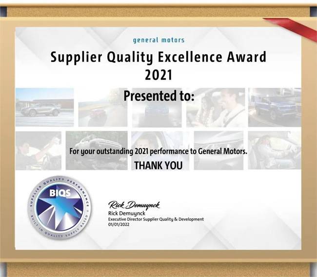 通用汽车作为全球整车制造业巨头,对供应商有严格、全面、系统的要求,“全球供应商质量表现优秀奖”评审委员会由通用汽车全球采购、质量、物流等部门的专家组成,从产品质量、物流、管理、体系、公司运营状况、综合成本以及新项目获得情况、供货量级等12个方面对供应商综合评价,且要求逐年提高,反映了供应商的全面质量管理水平。