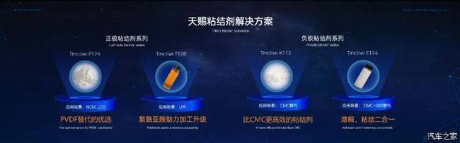 正极粉体粘结剂Tinctive P124具有高粘结力、耐高电压、供应稳定、溶解快的优点;PI类粘结剂Tinctive T126可应用于高固含浆料加工,助力磷酸铁锂电池正极片的加工升级;在负极领域,输出了CMC替换方案Tinctive K112以及增稠/粘结二合一粘结剂Tinctive E124等一系列解决方案。