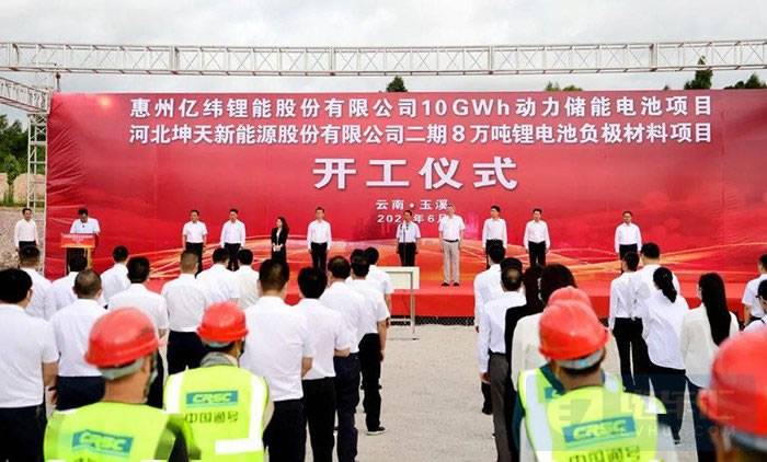 6月27日上午,惠州亿纬锂能股份有限公司10GWh动力储能电池项目、河北坤天新能源股份有限公司二期8万吨锂电池负极材料项目在玉溪高新区龙泉园区开工,标志着两家公司与玉溪市的合作迈出了关键步伐,玉溪市新能源电池产业发展取得新的实质性进展和突破。