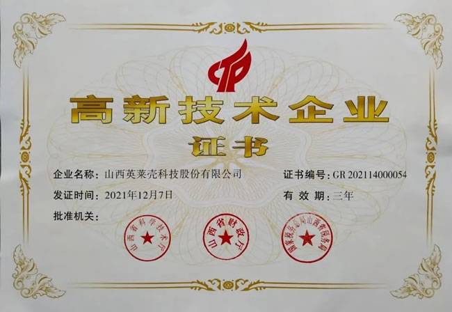 依据科技部、财政部、国家税务总局《高新技术企业认定管理办法》、《高新技术企业认定管理工作指引》的规定,山西省科学技术厅、山西省财政厅、省国税局经组织专家评审,通过严格的层层审查,英莱壳凭借过硬的研发实力和创新能力,一举通过国家级《高新技术企业证书》的认定!