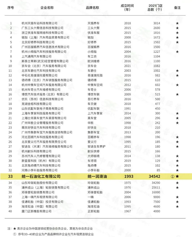 中国连锁经营协会作为连锁经营领域唯一的全国性行业组织,其发布的“2021年中国汽车后市场连锁企业Top40”是该协会结合行业发展现状,表彰为业内做出杰出贡献的标杆企业而推出的榜单。作为行业领先的能效润滑专家,统一在2021年面临疫情、润滑油业态下滑等诸多挑战的情况下,依然保持持续、稳健的增长态势。