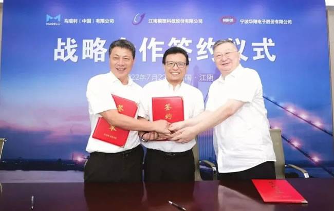 7月22日,马瑞利与江南模塑科技股份有限公司(以下简称“模塑科技”)和宁波华翔电子股份有限公司(以下简称“宁波华翔”)签署三方战略合作框架协议。马瑞利全球执行副总裁兼中国区总裁樊坚强、模塑科技董事长曹克波、宁波华翔董事长周晓峰等重要嘉宾携团队出席了现场签约仪式,并发表致辞。