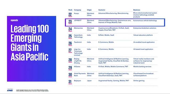 近日,毕马威公司(KPMG)和汇丰银行 (HSBC) 联合公布2022年亚太地区新兴企业巨头报告,并根据未来增长潜力,评选出领先的100家新兴巨头。均联智行 (JOYNEXT)位列第23名,也成为在泛科技行业中为数不多上榜的汽车领域企业。