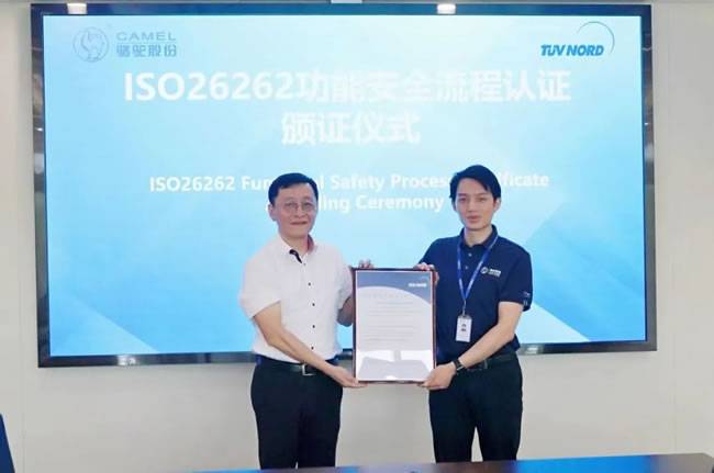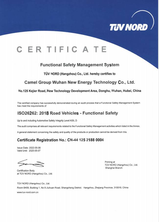 2022年7月6日,TUV NORD与骆驼集团武汉新能源科技有限公司(以下简称“骆驼集团创新研发中心”)在骆驼集团中试基地举行颁证仪式,授予骆驼集团创新研发中心ISO26262:2018功能安全流程认证证书(ASIL D等级)。该证书的获得标志着骆驼集团创新研发中心已完全满足ISO26262:2018汽车功能安全要求,建立了最高等级的锂离子电池系统产品开发流程体系,达到国际领先水平。这对于骆驼集团建立符合汽车功能安全要求的锂电池产品体系,具有里程碑式意义。