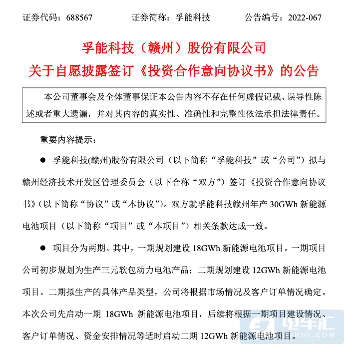8月1日晚,孚能科技发布公告称,孚能科技(赣州)股份有限公司拟与赣州经济技术开发区管理委员。双方就孚能科技赣州年产30GWh新能源电池项目相关条款达成一致。