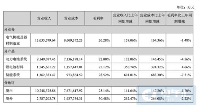 宁德时代目前的业务领域包括动力电池、锂电材料和储能三部分,2021年宁德时代储能系统业务的营业收入高达136.2亿元,同比增长601%,毛利率水平28.52%,高于动力电池系统和锂电池材料。