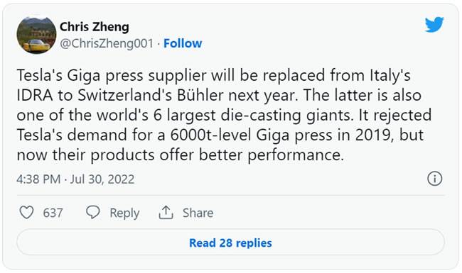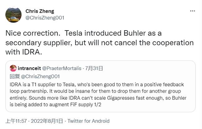 8月1日,郑小康回应推特用户intranceit,“感谢更正。特斯拉引入Bühler作为第二家压铸机供应商,但不会取消与IDRA的合作。”