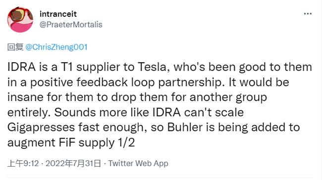 但是,当天,推特用户intranceit在这条推文下反驳道,“IDRA是特斯拉的一级供应商,双方合作良好。如果特斯拉突然更换供应商,那就太疯狂了。这个消息听起来更像是IDRA无法快速扩大Giga压铸机的生产规模,所以特斯拉加入Bühler来增加供应。”