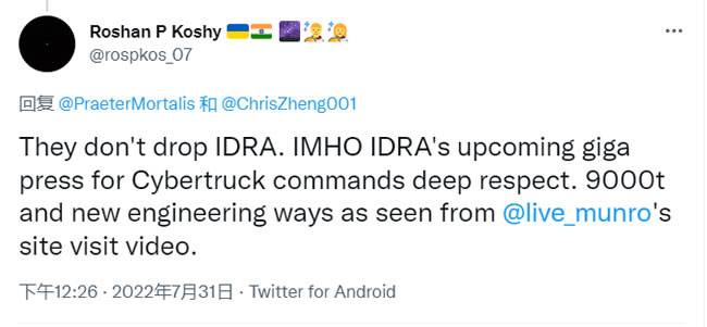 推特用户Roshan P Koshy也认同intranceit的观点,“特斯拉不会放弃IDRA。IMHO IDRA即将为Cybertruck提供的Giga压铸机令人敬佩。”