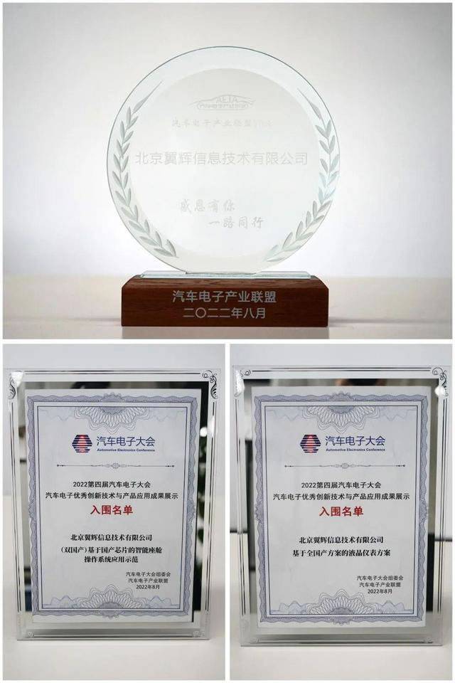 翼辉作为汽车电子产业联盟理事单位出席,在会上组织方为翼辉颁发了汽车电子联盟产业五十佳的奖项,并且翼辉(双国产)基于国产芯片的智能座舱操作系统应用示范与基于全国产方案的虚拟仪表显示方案两项产品同时入围 2022 汽车电子优秀创新技术与产品应用成果展示名单。