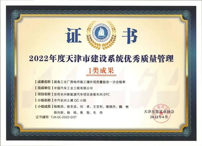 近日,中汽工程7个项目课题荣获2022年度天津市建设系统优秀质量管理成果奖,其中吉利长兴土建QC小组的《提高工业厂房地坪施工缝外观质量验收一次合格率》课题荣获一类成果奖;华域汽车项目、广西汽车项目等6项QC小组的课题分别荣获二类、三类成果奖。